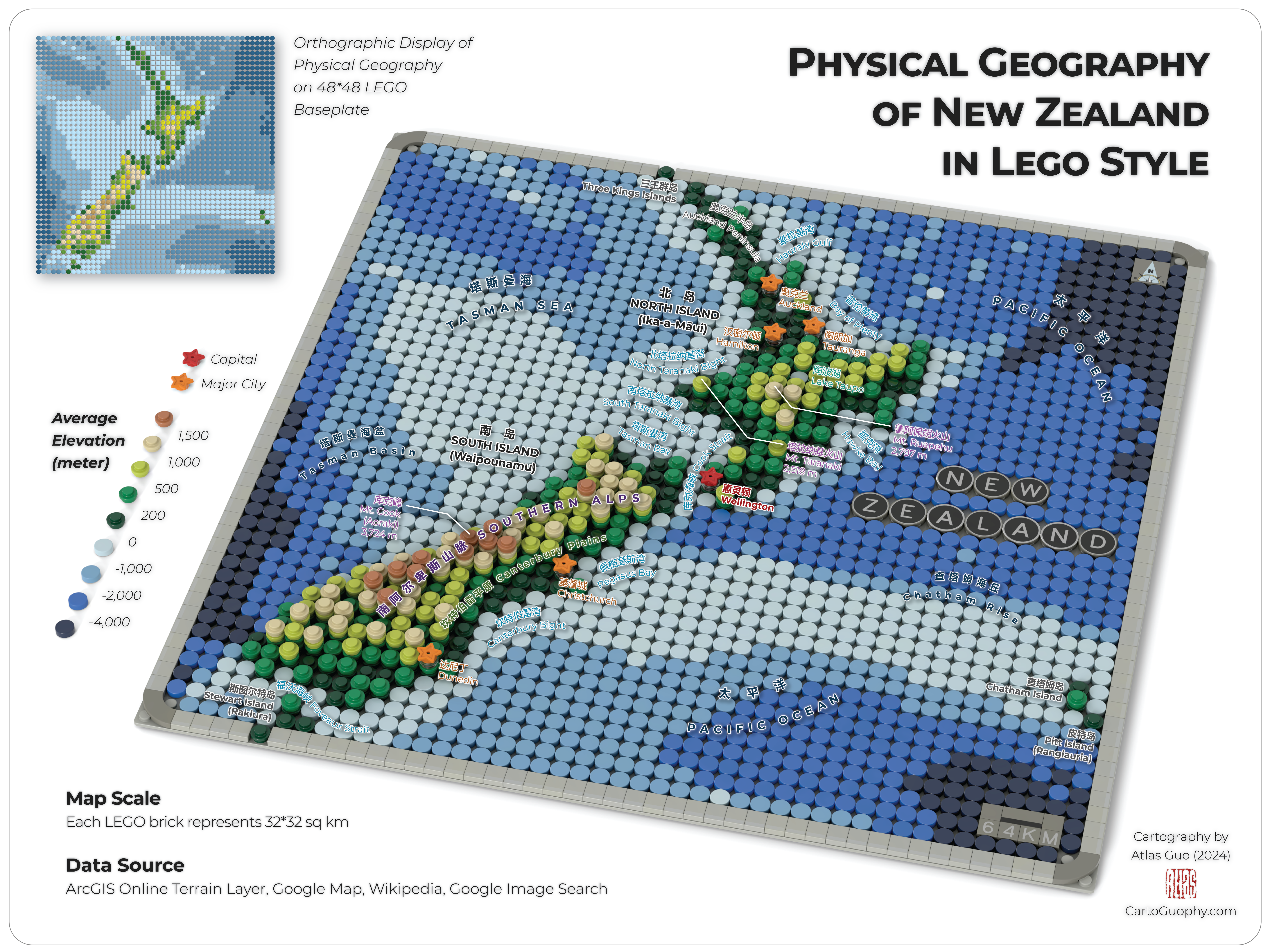With prior experience of making the award-winning LEGO style topographic maps of Wisconsin and Colorado, I am interested in exploring the visualization of complete physical geography including bathymetry, and New Zealand is a great case. Furthermore, I try to combine this casual form of cartography with precise labeling of geographic features. I probably assume both LEGO enthusiasts and map nerds would love it, and it might be used for education or tourism. Lastly, as a native Chinese speaker, adding the bilingual labels is not super challenging, while significantly expands the range of audiences.