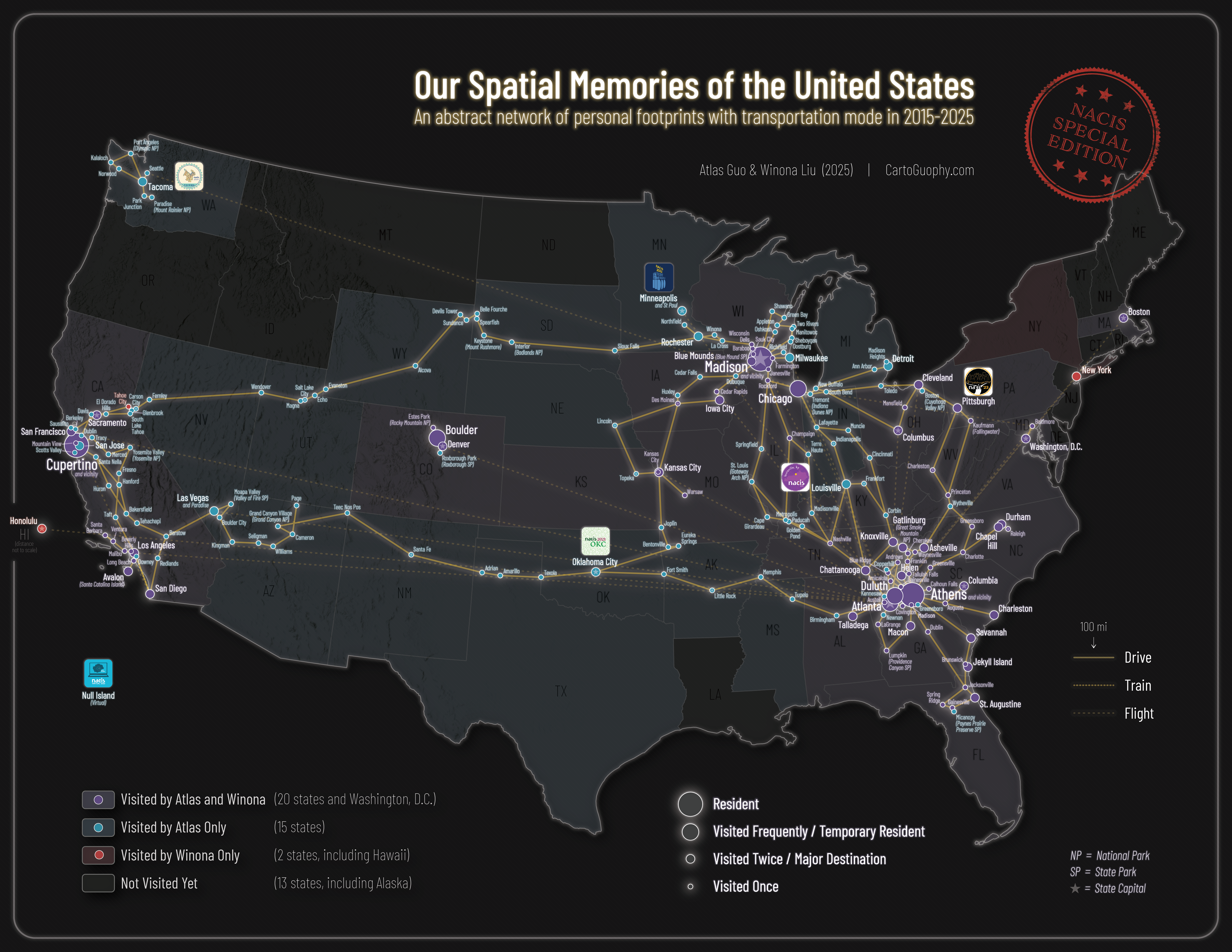 This map visualizes the footprint of me and my wife in the United States since 2015. There are several historical versions, and the latest update was in Sep 2025. An abstract network of our visited places (city center instead of real visited location) is added at different levels: resident, visited frequently, visited twice / major destination, visited once. Trips with different transportation mode are displayed using differently styled lines, and state capitals are displayed with a star symbol.
