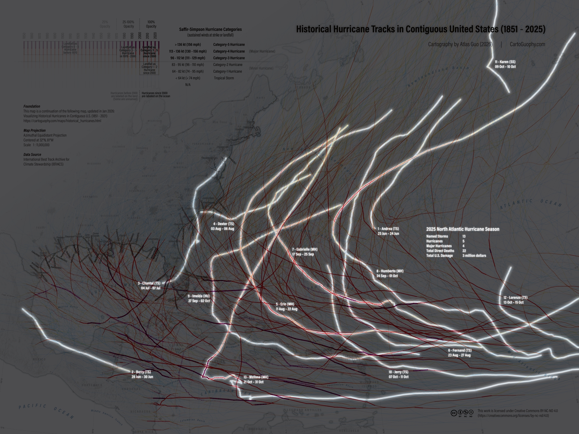 The map below is further updated with the 2025 data, plus a highlighted version. The 2025 Atlantic hurricane season saw no major hurricane make landfall in the United States, but Jamaica was severely impacted by Hurricane Melissa (under this map鈥檚 labeling rules, the storm name is not shown, but its tracks are clearly displayed).